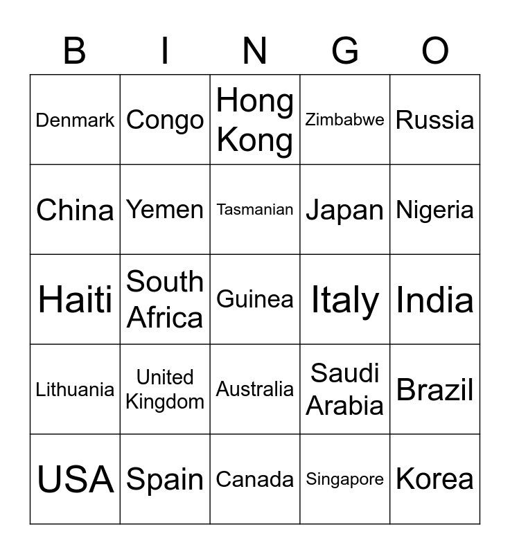 This bingo card has a free space and 24 words: United Kingdom, Spain, Tasmanian, USA, Russia, Denmark, China, Congo, Italy, Australia, Japan, Haiti, Saudi Arabia, Brazil, Yemen, Singapore, India, Hong Kong, Nigeria, South Africa, Korea, Lithuania, Zimbabwe and Canada.