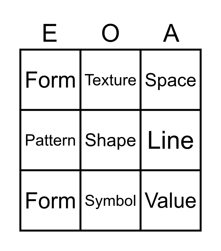 This bingo card has a free space and 11 words: Colour, Symbol, Value, Form, Texture, Space, Line, Pattern/Symbol, Pattern, Form and Value.