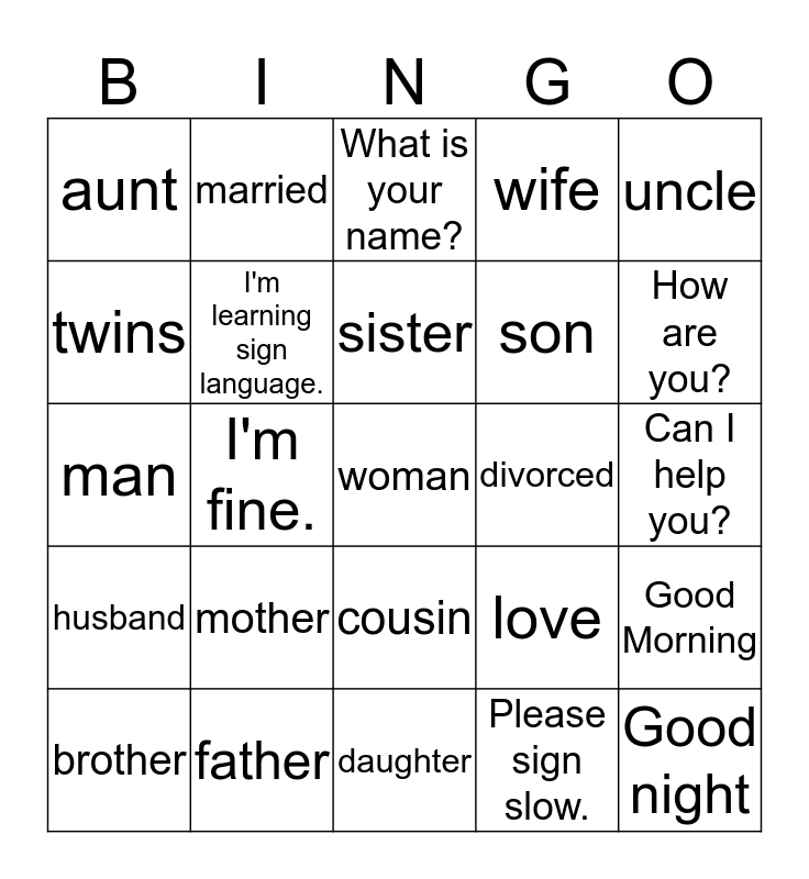 This bingo card has a free space and 24 words: mother, father, sister, brother, uncle, aunt, twins, married, divorced, cousin, son, man, love, Good Morning, I'm learning sign language., Please sign slow., Can I help you?, What is your name?, How are you?, I'm fine., Good night, husband, wife and daughter.