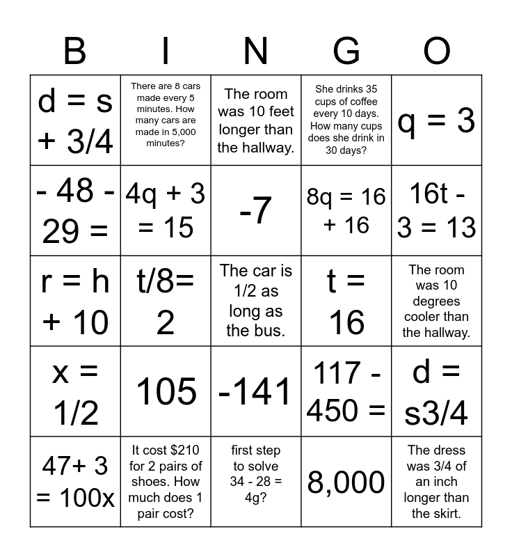 This bingo card has a free space and 39 words: -89 - 52 =, -25 + 18 =, first step to solve 2z + 5= 12?, 4q + 3 = 15, 47+ 3 = 100x, -141, -7, Subtract 5, q = 3, x = 1/2, t/8= 2, She drinks 35 cups of coffee every 10 days. How many cups does she drink in 30 days?, The dress was 3/4 of an inch longer than the skirt., The room was 10 degrees cooler than the hallway., t = 16, 105, c = 1/2b, d = s + 3/4, r = h -10, 117 - 450 =, - 48 - 29 =, first step to solve 34 - 28 = 4g?, 8q = 16 + 16, 16t - 3 = 13, 333, 77, Subtract 6, q = 4, t = 1, There are 8 cars made every 5 minutes. How many cars are made in 5,000 minutes?, The car is 1/2 feet shorter than the boat., The length of the dog was 3/4 as much as the skateboard., The room was 10 feet longer than the hallway., It cost $210 for 2 pairs of shoes. How much does 1 pair cost?, 8,000, c = b-1/2, d = s3/4, r = h + 10 and 105.