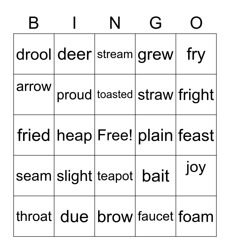 This bingo card has a free space and 28 words: joy, join, straw, faucet, arrow, stream, deer, seam, plain, throat, fried, grew, due, brow, fright, stray, slight, proud, toasted, teapot, drool, took, foam, heap, feast, bait, fry and joyful.
