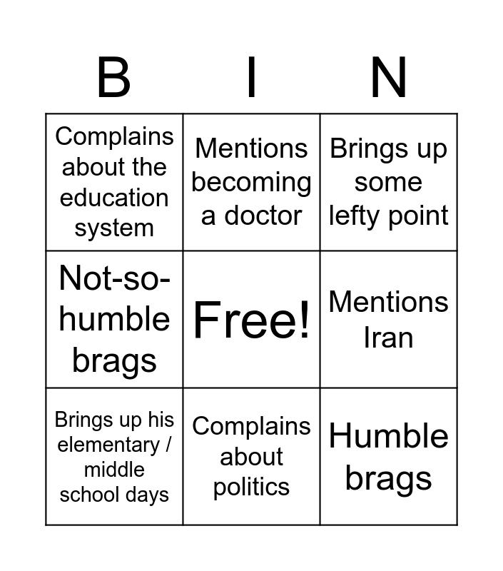 This bingo card has a free space and 8 words: Mentions Iran, Brings up some lefty point, Mentions becoming a doctor, Brings up his elementary / middle school days, Complains about the education system, Humble brags, Not-so-humble brags and Complains about politics.