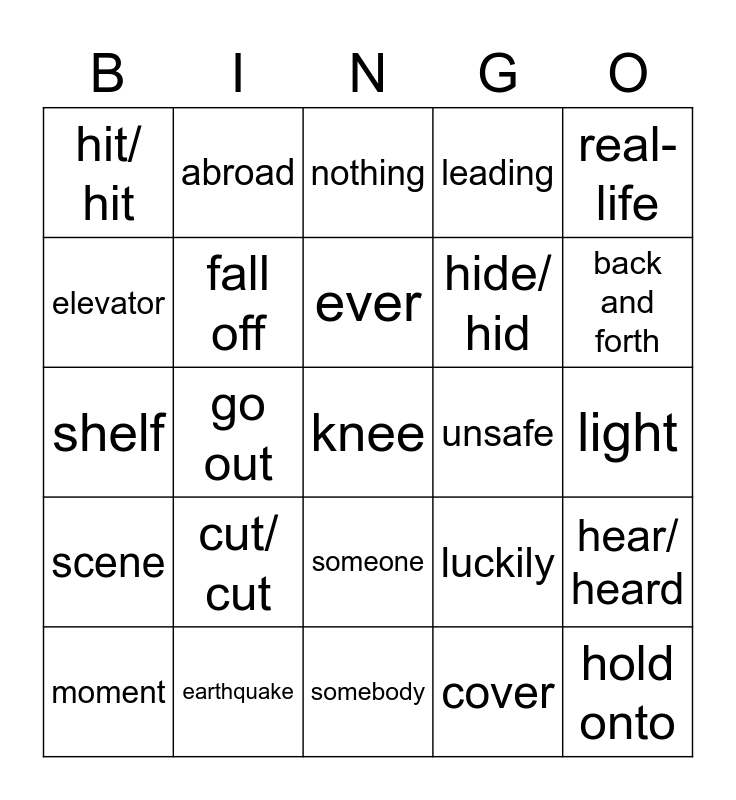 This bingo card has a free space and 24 words: cut/ cut, earthquake, ever, moment, real-life, hit/ hit, elevator, abroad, unsafe, someone, hide/ hid, shelf, luckily, hear/ heard, fall off, cover, light, nothing, back and forth, go out, hold onto, scene, leading and somebody.