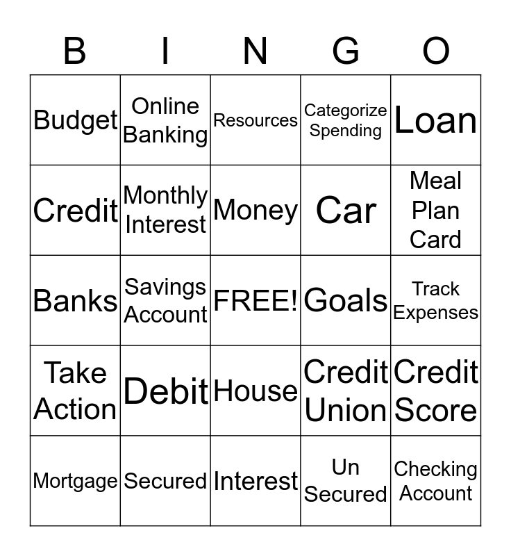 This bingo card has a free space and 24 words: Debit, Secured, Money, Mortgage, Loan, Budget, Credit, Online Banking, Goals, House, Car, Banks, Credit Union, Credit Score, Monthly Interest, Un Secured, Track Expenses, Resources, Meal Plan Card, Savings Account, Checking Account, Take Action, Categorize Spending and Interest.