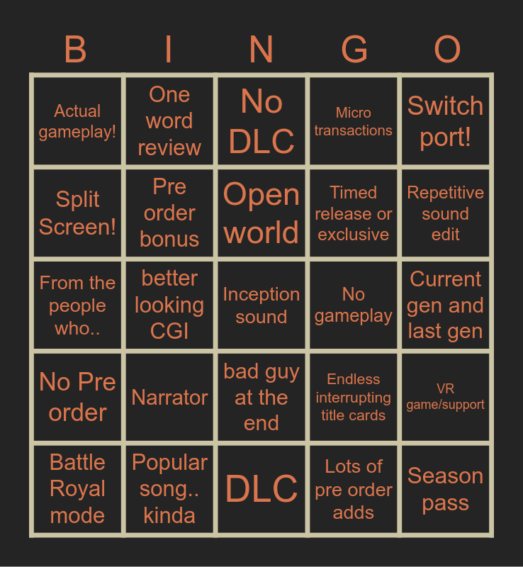 This bingo card has 30 words: Popular song.. kinda, In and out slow motion, better looking CGI, “Gameplay”, Actual gameplay!, No DLC, Pre order bonus, bad guy at the end, No gameplay, DLC, Current gen and last gen, Inception sound, Lots of pre order adds, Season pass, Repetitive sound edit, Co-op, Endless interrupting title cards, No Pre order, Narrator, Switch port!, From the people who.., Sequel, One word review, Timed release or exclusive, Split Screen!, Micro transactions, VR game/support, Battle Royal mode, Open world and Side kick.