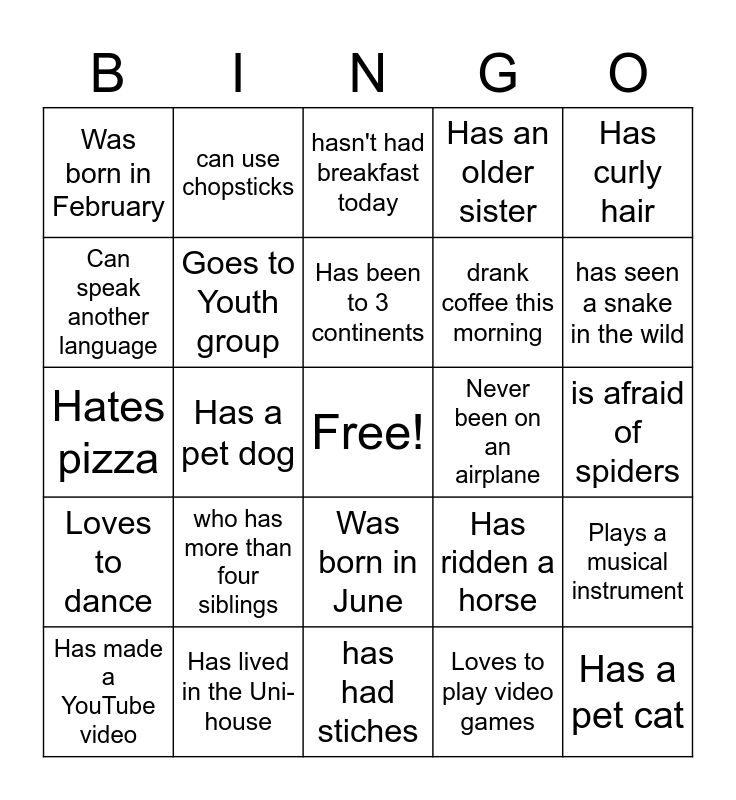 This bingo card has a free space and 35 words: Rides a motorcycle, Has a younger brother, Is left handed, Goes to Youth group, Was born in June, Has an older sister, Can speak another language, Plays on the St Marks Soccer Team, Has been to 3 continents, Loves Bunnings Sausage sizzle, Hates pizza, Has curly hair, Has a beard, Is an only child, Was born in February, Never been on an airplane, Loves to play video games, Has a pet dog, Loves to dance, Has a pet cat, Has ridden a horse, Has made a YouTube video, Plays a musical instrument, Has lived in the Uni-house, hasn't had breakfast today, has seen a snake in the wild, bites his/her fingernails, was born in January, drank coffee this morning, is afraid of spiders, wears socks to bed, has had stiches, who has more than four siblings, can use chopsticks and can whistle.