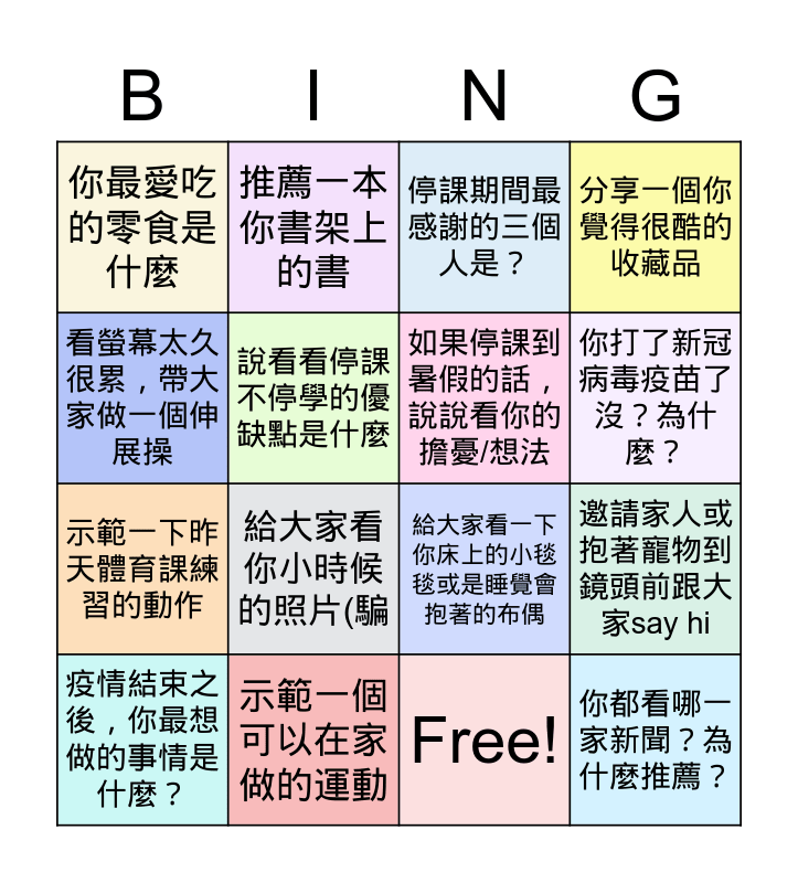 This bingo card has 16 words: 示範一個可以在家做的運動, 邀請家人或抱著寵物到鏡頭前跟大家say hi, 停課期間最感謝的三個人是?, 你最愛吃的零食是什麼, 示範一下昨天體育課練習的動作, 推薦一本你書架上的書, 給大家看一下你床上的小毯毯或是睡覺會抱著的布偶, Free!, 看螢幕太久很累,帶大家做一個伸展操, 說看看停課不停學的優缺點是什麼, 疫情結束之後,你最想做的事情是什麼?, 分享一個你覺得很酷的收藏品, 給大家看你小時候的照片(騙, 你打了新冠病毒疫苗了沒?為什麼?, 如果停課到暑假的話,說說看你的擔憂/想法 and 你都看哪一家新聞?為什麼推薦?.