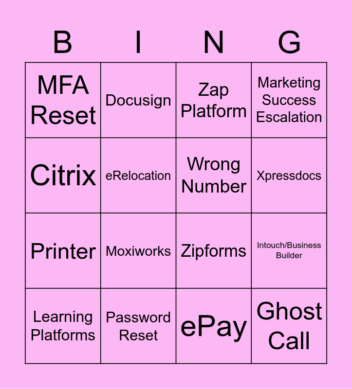 This bingo card has 16 words: Password Reset, Intouch/Business Builder, Zap Platform, MFA Reset, Printer, Docusign, Zipforms, ePay, Citrix, eRelocation, Learning Platforms, Marketing Success Escalation, Moxiworks, Xpressdocs, Wrong Number and Ghost Call.