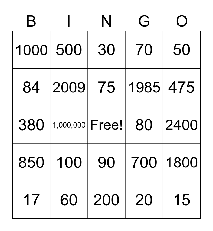 This bingo card has a free space and 44 words: 10, 15, 19, 17, 12, 20, 30, 40, 50, 60, 70, 80, 90, 100, 150, 200, 340, 380, 490, 475, 500, 680, 620, 1000, 2000, 2400, 2021, 2022, 700, 850, 3000, 1800, 1200, 4000, 1,000,000, 7400, 8000, 45, 75, 84, 1985, 2005, 2009 and 2012.