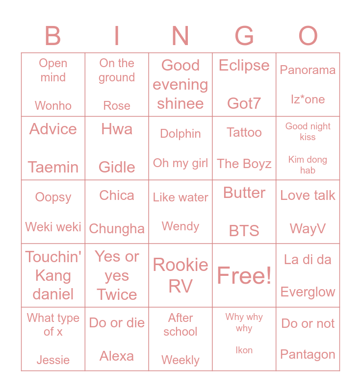 This bingo card has 25 words: Yes or yes Twice, After school Weekly, Dolphin Oh my girl, What type of x Jessie, Panorama Iz*one, Open mind Wonho, Advice Taemin, On the ground Rose, Butter BTS, Rookie RV, Tattoo The Boyz, Oopsy Weki weki, Free!, La di da Everglow, Hwa Gidle, Do or not Pantagon, Love talk WayV, Good evening shinee, Good night kiss Kim dong hab, Chica Chungha, Like water Wendy, Do or die Alexa, Touchin' Kang daniel, Eclipse Got7 and Why why why Ikon.