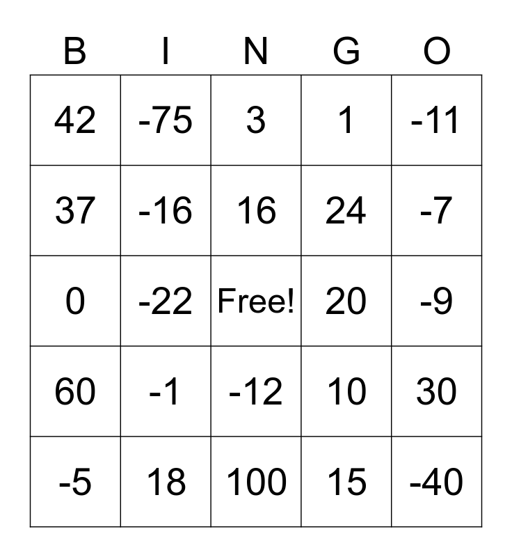 This bingo card has a free space and 24 words: -1, 18, 16, -5, -11, 42, 37, -75, 20, -12, 24, 0, 10, 30, -16, 15, -9, 3, -7, -22, -40, 60, 1 and 100.