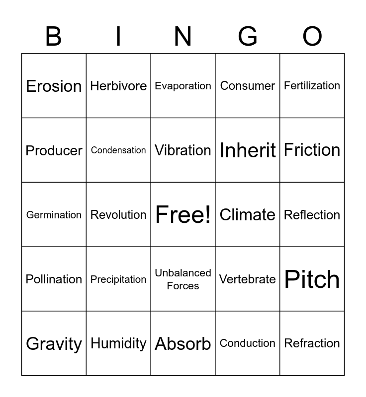 This bingo card has a free space and 29 words: Gravity, Rotation, Revolution, Weathering, Erosion, Evaporation, Condensation, Precipitation, Climate, Humidity, Reflection, Refraction, Absorb, Conduction, Friction, Balanced Forces, Unbalanced Forces, Pollination, Fertilization, Germination, Vertebrate, Invertebrate, Inherit, Producer, Consumer, Herbivore, Pitch, Vibration and Energy.