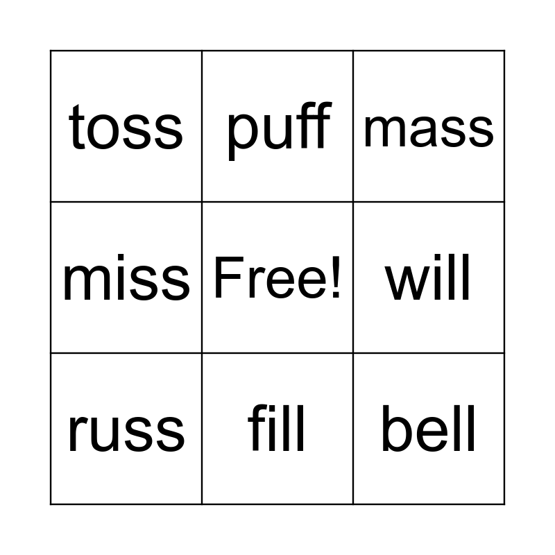 This bingo card has a free space and 8 words: will, mass, puff, russ, toss, bell, miss and fill.