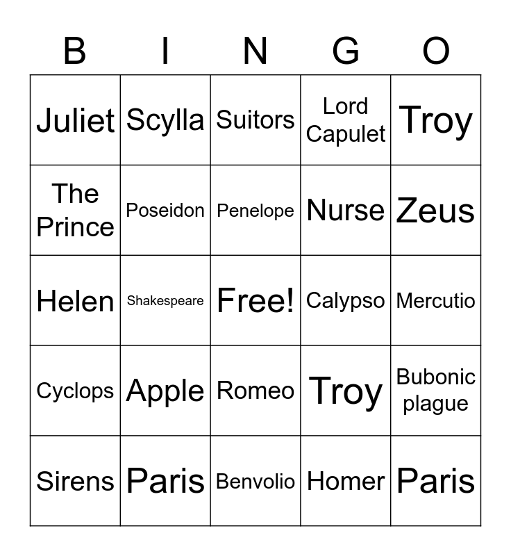 This bingo card has a free space and 34 words: Odysseus, Homer, Telemachus, Athena, Cyclops, Poseidon, Troy, Sirens, Scylla, Charybdis, Penelope, Suitors, Aeolus, Circe, Calypso, Zeus, Paris, Helen, Apple, Troy, Romeo, Tybalt, Juliet, Mercutio, Benvolio, Paris, Lord Capulet, Friar Laurence, Nurse, The Prince, Soliloquy, Shakespeare, Bubonic plague and The Globe.
