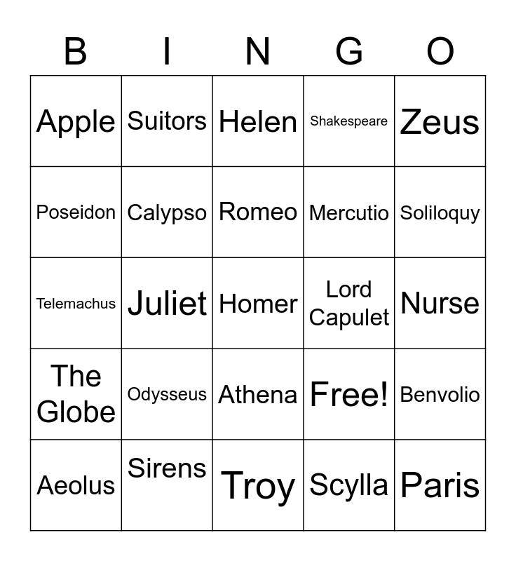 This bingo card has 25 words: Odysseus, Troy, Romeo, Aeolus, Zeus, Apple, Poseidon, Suitors, Lord Capulet, Athena, Mercutio, Telemachus, Free!, Benvolio, Calypso, Paris, Nurse, Helen, Soliloquy, Juliet, Homer, Sirens, The Globe, Shakespeare and Scylla.