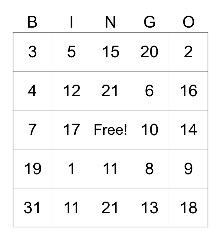 This bingo card has a free space and 24 words: 1, 11, 21, 31, 2, 3, 4, 5, 10, 11, 6, 7, 8, 9, 12, 13, 14, 15, 16, 17, 18, 19, 20 and 21.