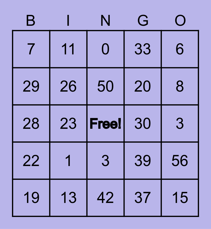 This bingo card has a free space and 29 words: 19, 44, 23, 4, 7, 0, 26, 1, 30, 13, 3, 15, 42, 37, 8, 41, 3, 22, 6, 28, 39, 12, 20, 29, 33, 11, 56, 50 and 52.