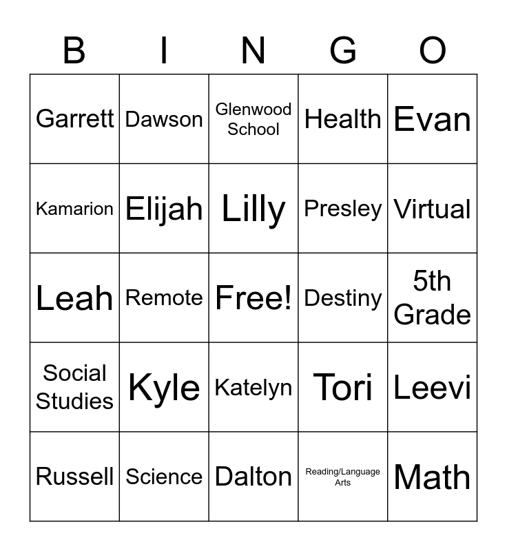 This bingo card has a free space and 25 words: Kyle, Dalton, Lilly, Russell, Evan, Garrett, Kamarion, Dawson, Destiny, Katelyn, Presley, Leah, Tori, Leevi, Elijah, Mrs. Meadows, 5th Grade, Glenwood School, Virtual, Remote, Math, Science, Social Studies, Health and Reading/Language Arts.