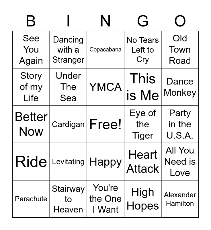 This bingo card has a free space and 54 words: 24K Magic, Ride, Can't Stop the Feeling, Meant to Be, Happy, We are the Champions, No Tears Left to Cry, Don't Stop Believin', Story of my Life, Call me Maybe, See You Again, We're All in This Together, Stairway to Heaven, Parachute, Cupid Shuffle, You're the One I Want, Alexander Hamilton, This is Me, Back in Black, Party in the U.S.A., Heart Attack, Be Our Guest, Eye of the Tiger, Old Town Road, Hey Look Ma, I made it, Dancing with a Stranger, She Got the Best of Me, Happier, Girls Like You, High Hopes, Baby Shark, We will Rock YOu, What Ifs, How Far Will I go, Copacabana, RadioActive, Better Now, All You Need is Love, Let It Go, Under The Sea, Single Ladies, The Middle, Drivers License, Follow You, Levitating, Save Your Tears, 10,000 Hours, Everything I wanted, YMCA, Cardigan, Dance Monkey, King and Queens, Dynamite and What do you mean?.