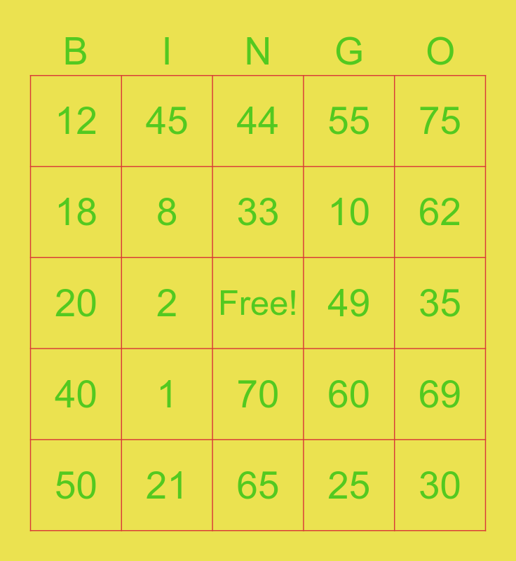 This bingo card has a free space and 24 words: 1, 21, 33, 50, 75, 12, 18, 45, 49, 70, 10, 20, 60, 69, 8, 25, 35, 44, 62, 2, 30, 40, 55 and 65.