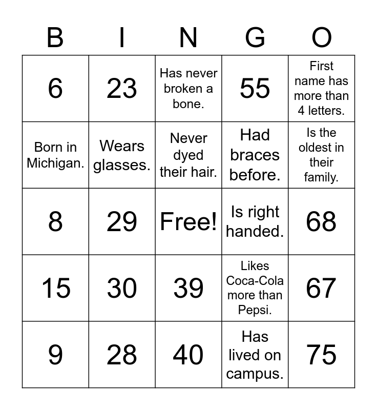 This bingo card has a free space and 75 words: Has more than one pet., Played a high school sport., Has never broken a bone., Has never been pulled over by the cops., Played an instrument., Had more than one job., Has at least one sibling., Has worked at EMU., Has lived on campus., Has been to another country., Speaks another language., Was born in the months July - December., Is right handed., Is the oldest in their family., Drives a car., Wears glasses., Has lived in more than one house., Likes Coca-Cola more than Pepsi., Afraid of heights., Born in Michigan., Has brown eyes., Never dyed their hair., Had braces before., First name has more than 4 letters., 6, 21, 35, 51, 66, 7, 22, 36, 52, 67, 8, 23, 37, 53, 68, 9, 24, 38, 54, 69, 10, 25, 39, 55, 70, 11, 26, 40, 56, 71, 12, 27, 41, 57, 72, 13, 28, 42, 58, 73, 14, 29, 43, 59, 74, 15, 30, 44, 60, 75 and 45.