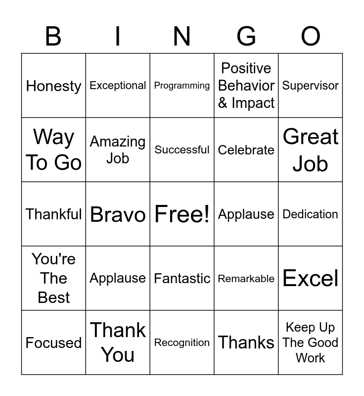 This bingo card has a free space and 138 words: Pat on the Back, Thanks, Appreciate, Grateful, Gratitude, Thankful, Thank You, Appreciative, Applause, Recognize, Recognition, Kudos, Great Work, Amazing Job, High Five, Bravo, Fantastic, Teamwork, Commendation, Bravo, Dedication, Compliment, Celebrate, Awesome, Kudos, Applause, Dedication, Appreciative, Appreciate, Grateful, Bravo, Compliment, Thanks, Recognize, Super, Fantastic, Amazing, Extraordinary, Impressive, Magnificent, Incredible, Marvelous, Spectacular, Fabulous, Stupendous, Exceptional, Phenomenal, Applause, Awesome, Accountability, Remarkable, Sensational, Appreciative, Believe in Your Ability, Can Do Attitude, Amazing Job, Achievement, Champion, Commendation, Beneficial, Above& Beyond, Advancement, Compliment, Continually Improve, Committed, Capable, Celebrate, Excellence, Dedication, Deliver, Communication, Community, Fantastic, Dignity, Empowerment, Dependable, Enthusiastic, Going Places, Excel, Exceptional, Encouraging, Fabulous, Helpful, Great Job, Focused, Extraordinary, Hats Off, Impressive, High Five, Greatness, Friendly, Job Well Done, Joy, Incredible, Honesty, Growth, Marvelous, Optimistic, Keep Up The Good Work, Innovative, Hooray, Opportunities, Positive Behavior & Impact, Never Give Up, On Time, Integrity, Phenomenal, Punctual, Organized, Partnership, Magnificent, Programming, Remarkable, Proactive, Sensational, Persevere, Recognition, So Proud Of You, Purchasing, Supportive, Professional& Courteous, Smart, Superb, Respectable, Way To Go, Stupendous, Successful, Valuable, Spectacular, You're The Best, Team Players, Teamwork, You Rock, Supervisor, Wonderful, Worthy, Visionary and You're On Your Way.