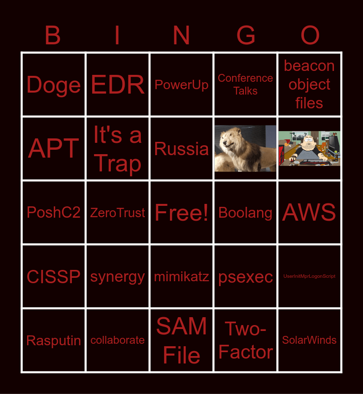 This bingo card has 2 images, a free space and 22 words: synergy, collaborate, Russia, Rasputin, beacon object files, Doge, APT, EDR, Boolang, mimikatz, PoshC2, psexec, UserInitMprLogonScript, It's a Trap, Two-Factor, AWS, PowerUp, ZeroTrust, SolarWinds, CISSP, Conference Talks and SAM File.
