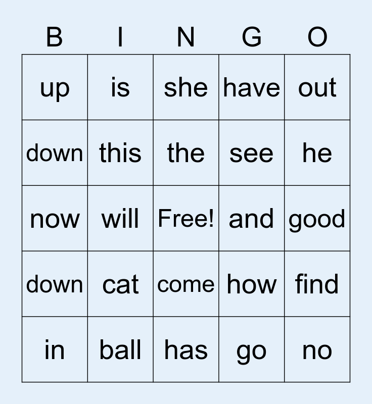 This bingo card has a free space and 24 words: cat, ball, the, in, out, up, down, is, and, come, see, now, how, find, this, go, good, she, he, will, no, down, have and has.
