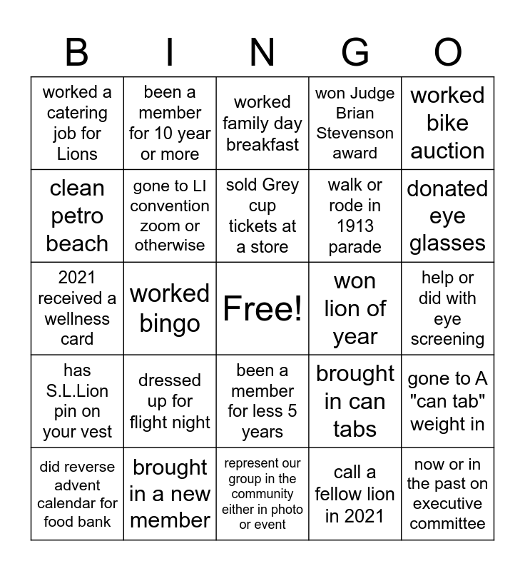 This bingo card has a free space and 24 words: dressed up for flight night, brought in a new member, sold Grey cup tickets at a store, did reverse advent calendar for food bank, worked bike auction, worked a catering job for Lions, clean petro beach, been a member for 10 year or more, won lion of year, been a member for less 5 years, walk or rode in 1913 parade, 2021 received a wellness card, brought in can tabs, gone to A "can tab" weight in, gone to LI convention zoom or otherwise, call a fellow lion in 2021, help or did with eye screening, worked family day breakfast, donated eye glasses, worked bingo, now or in the past on executive committee, has S.L.Lion pin on your vest, won Judge Brian Stevenson award and represent our group in the community either in photo or event.