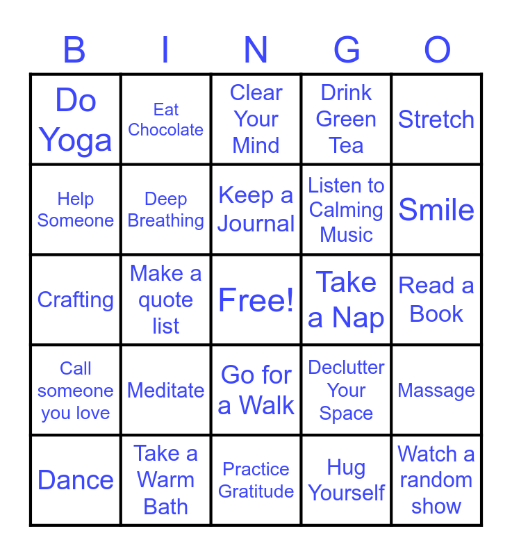 This bingo card has a free space and 24 words: Meditate, Take a Warm Bath, Keep a Journal, Dance, Stretch, Do Yoga, Help Someone, Eat Chocolate, Take a Nap, Go for a Walk, Listen to Calming Music, Crafting, Declutter Your Space, Massage, Deep Breathing, Hug Yourself, Read a Book, Clear Your Mind, Smile, Make a quote list, Watch a random show, Call someone you love, Drink Green Tea and Practice Gratitude.