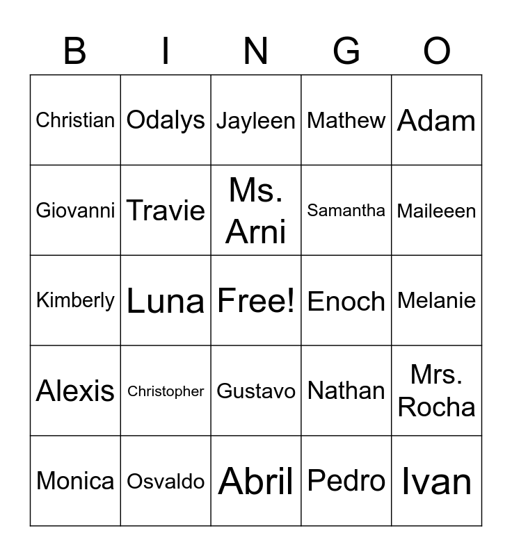 This bingo card has a free space and 29 words: Monica, Mia, Luna, MaryJane, Christian, Jayleen, Travie, Christopher, Enoch, Osvaldo, Melanie, Ivan, Abril, Pedro, Maileeen, Natalie, Gustavo, Alexis, Adam, Kimberly, Nathan, Itzel, Samantha, Giovanni, Mathew, Odalys, Mrs. Rocha, Ms. Arni and Mrs. Fults.