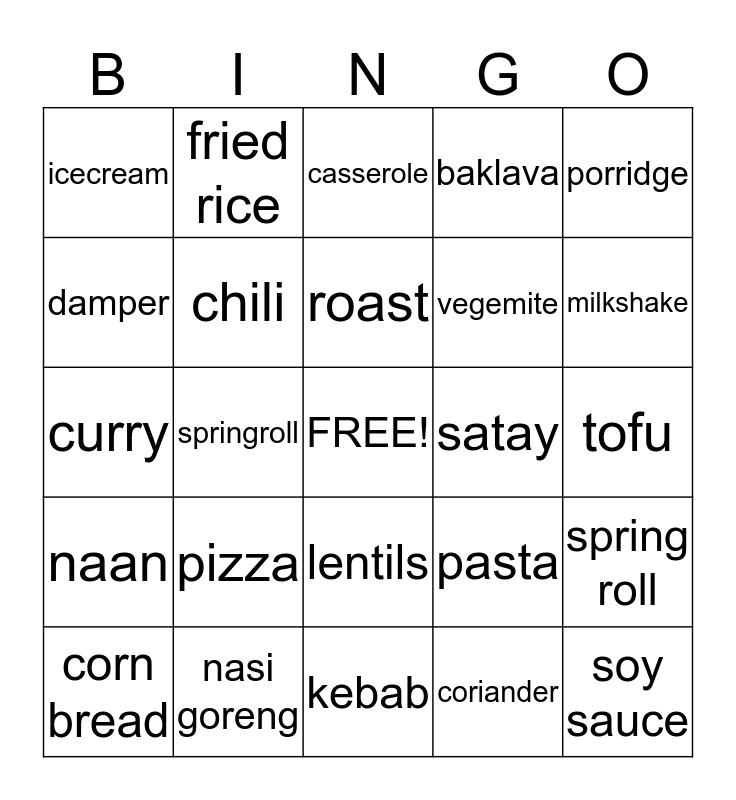 This bingo card has a free space and 24 words: pizza, nasi goreng, roast, corn bread, porridge, icecream, damper, fried rice, satay, lentils, vegemite, curry, pasta, spring roll, chili, coriander, tofu, casserole, milkshake, springroll, soy sauce, naan, baklava and kebab.