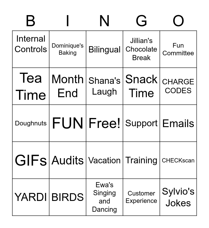 This bingo card has a free space and 31 words: Ewa's Singing and Dancing, TEAM, FUN, Reports, Internal Controls, Bilingual, Month End, Training, Support, Customer Experience, Emails, Sylvio's Jokes, Webex, AR Coffee Chat, CHARGE CODES, Virtual Business Essentials, CHECKscan, Audits, GIFs, Vacation, Fun Committee, Team Checkpoint, YARDI, Dominique's Baking, Snack Time, Tea Time, Jillian's Chocolate Break, Doughnuts, BIRDS, Shana's Laugh and Knowledgeable.