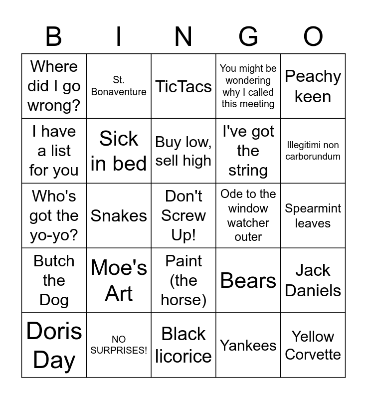 This bingo card has a free space and 34 words: Solitaire, Yankees, Do I know him?, Talon, Butch the Dog, Sick in bed, Peachy keen, Doris Day, St. Bonaventure, The Duke, Buy low, sell high, TicTacs, Peanuts, Booz Allen, Ode to the window watcher outer, Illegitimi non carborundum, NO SURPRISES!, Who's got the yo-yo?, Moe's Art, Bears, Paint (the horse), This game show was his favorite (mark if you are correct!), Where did I go wrong?, Spearmint leaves, Black licorice, Yellow Corvette, You might be wondering why I called this meeting, I'll take you places, I've got the string, I have a list for you, Knee high socks, Snakes, Jack Daniels and Toby I,II,III,IV.
