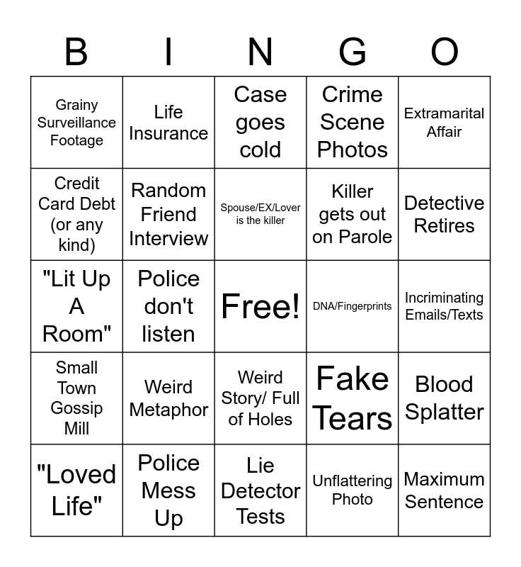 This bingo card has a free space and 34 words: 911 Call Recording, Unflattering Photo, "Like A Fairytale", Texas/Arizona/Florida, Small Town Gossip Mill, Random Friend Interview, Extramarital Affair, "Loved Life", Life Insurance, Spouse/EX/Lover is the suspect, Spouse/EX/Lover is the killer, Case goes cold, Hitman, A dog (K-9 or family pet), DNA/Fingerprints, Detective Retires, Police Mess Up, "Lit Up A Room", Weird Metaphor, Fake Tears, Weird Story/ Full of Holes, No Alibi/ Faulty Alibi, Grainy Surveillance Footage, Incriminating Emails/Texts, Lie Detector Tests, Maximum Sentence, Crime Scene Photos, Weird Haircut, Killer gets out on Parole, Credit Card Debt (or any kind), Keith Morrison, Police don't listen, Blood Splatter and Shoe Prints/ Tire Tracks.