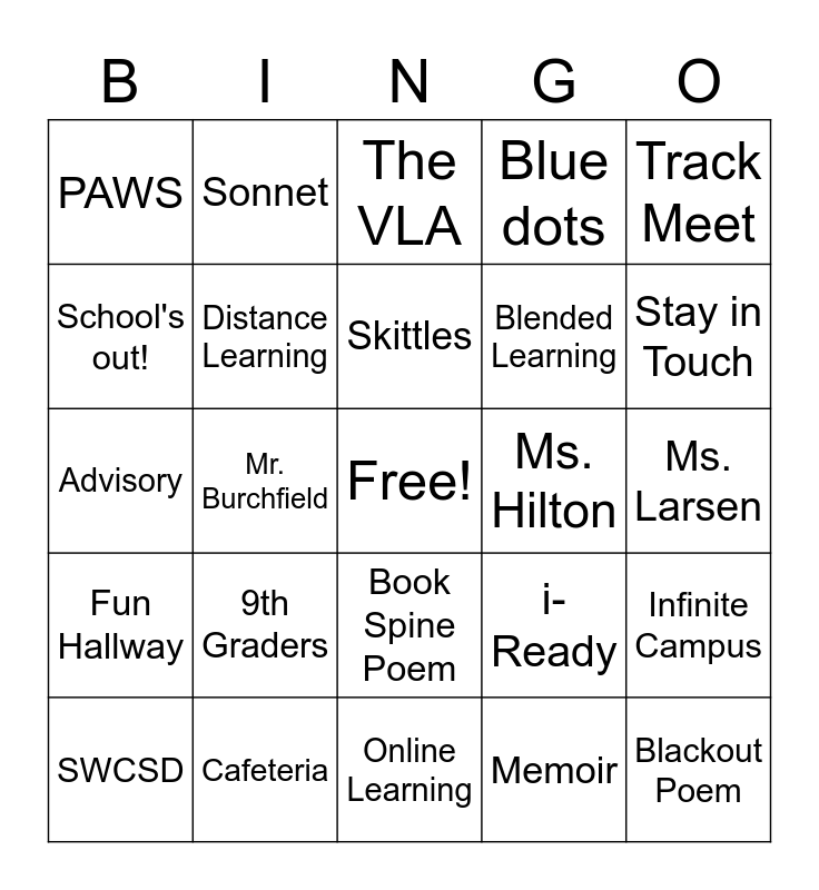 This bingo card has a free space and 100 words: Language Arts, Pleasant View Middle School, Ms. Larsen, Ms. Barone, Mr. Harmon, Mr. Washington, Panthers, Summer Break, Reading, Writing, PVMS, Ponies, Mrs. Wendel, Cafeteria, Blue Group, Green Group, Blended Learning, Class of 2025, Novel, Chromebook, Google Meet, Face Mask, Growth Period, Mrs. Weer, Mrs. Burton, Ms. Hilton, Track Meet, i-Ready, Auditorium, Ohio State Test, Mr. Burchfield, PAWS, PRIDE Student, Dystopian Stories, Memoir, Skittles, Infinite Campus, Google Classroom, Room 127, Exploring Careers, Gmail, Books, Advisory, Cutting Out Party, Stay in Touch, The VLA, Yearbook, School Counseling, Hybrid Learning, Online Learning, Pandemic, Socially Distanced, Central Crossing, Westland, Mr. Hoffman, Power of the Pen, Weekly Agenda, Book Not Made Into A Movie, Persevere, Blue dots, Among Us, Make It A Great Day or Not, Mr. Harris, Ms. Black, Ms. Mellon, Ms. May, Mr. Morford, Wednesdays at Home, Spinny Wheel Raffles, Kahoot, 8th Graders, 9th Graders, Freshman Year, High Schooler, Career Academy, South-Western City Schools, No Air Conditioning, School's out!, I'll miss you!, Proud of you!, You Are Loved, Blackout Poem, Paint Chip Poetry, Book Spine Poem, Congrats, Newly Minted, Sonnet, 2020-2021, Peace, Love, Panthers, Secret Hallway, Fun Hallway, Cyan Nation, Lunch, AR, SWCSD, Distance Learning, Dream Big, Be Hopeful, School Bus, Word Searches and Cracker Barrel Game.