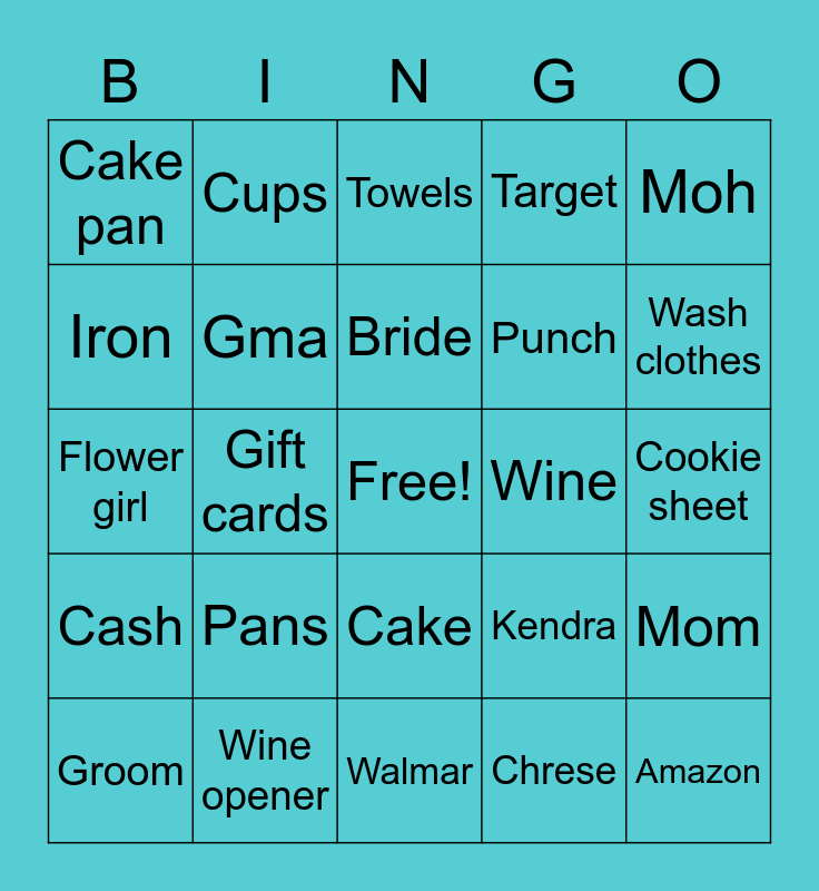 This bingo card has a free space and 24 words: Pans, Wine opener, Bride, Groom, Moh, Cake pan, Iron, Cups, Wine, Cake, Punch, Flower girl, Kendra, Mom, Gma, Chrese, Cookie sheet, Towels, Wash clothes, Gift cards, Amazon, Cash, Target and Walmar.