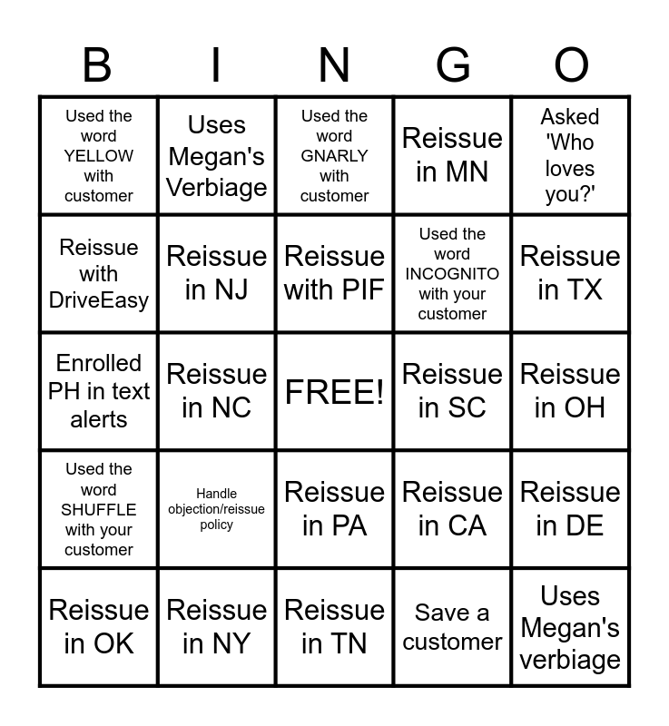 This bingo card has a free space and 24 words: Handle objection/reissue policy, Reissue in NY, Reissue with PIF, Reissue in OK, Asked 'Who loves you?', Used the word YELLOW with customer, Reissue with DriveEasy, Uses Megan's Verbiage, Reissue in SC, Reissue in PA, Used the word INCOGNITO with your customer, Enrolled PH in text alerts, Reissue in CA, Reissue in DE, Reissue in NJ, Save a customer, Reissue in OH, Used the word GNARLY with customer, Reissue in TX, Reissue in NC, Uses Megan's verbiage, Used the word SHUFFLE with your customer, Reissue in MN and Reissue in TN.