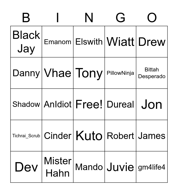 This bingo card has a free space and 24 words: Cinder, Mister Hahn, Tony, Dev, Drew, Black Jay, Danny, Emanom, Dureal, Kuto, PillowNinja, Shadow, Robert, James, Vhae, Juvie, Jon, Elswith, Bittah Desperado, AnIdiot, gm4life4, Tichrai_Scrub, Wiatt and Mando.