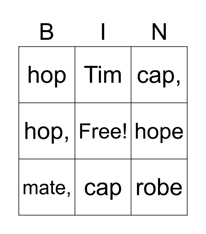 This bingo card has 25 words: mat, mate, cap, cape, Free!, hop, hope, Tim, time, rob, robe, tub, tube, mat,, mate,, rob,, robe,, cap,, cape,, tub,, tube,, Tim,, time,, hop, and hope.