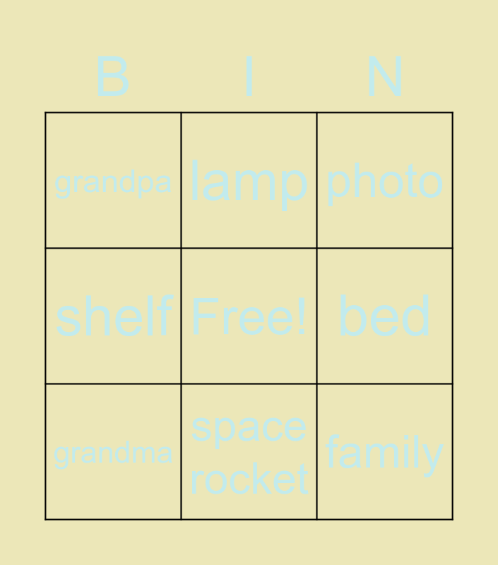 This bingo card has a free space and 8 words: bed, photo, lamp, grandma, grandpa, family, shelf and space rocket.