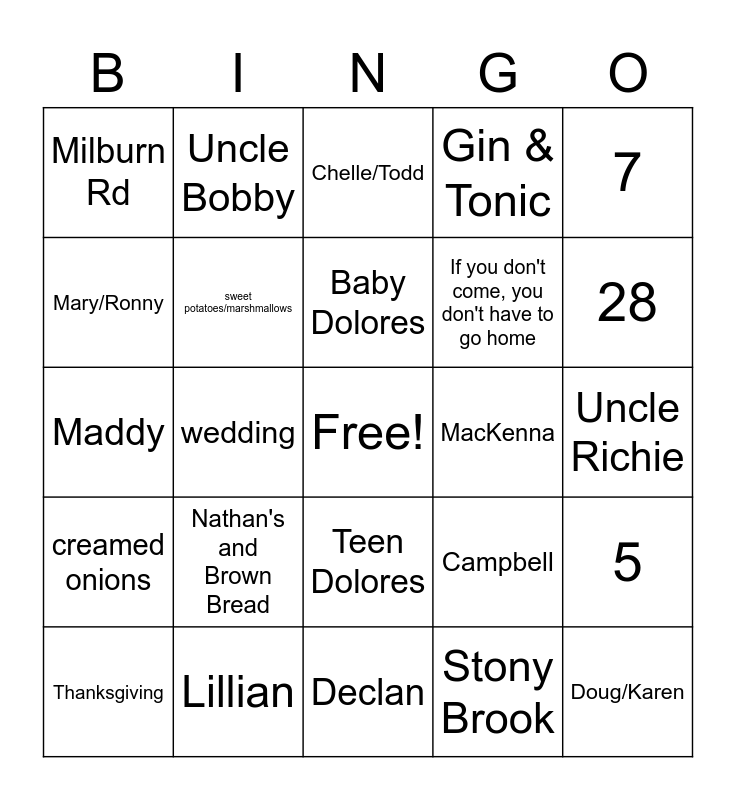 This bingo card has a free space and 64 words: 1941, May, 13, 5, Matthews, Nanny/Pop Pop, Uncle Bobby, Aunt Virginia, Baby Dolores, Cream Cheese & Jelly, Teen Dolores, elementary school, Uncle Richie, 7, 1968, Mary/Ronny, wedding, Milburn Rd, 6, If you don't come, you don't have to go home, Nathan's and Brown Bread, creamed onions, Gin & Tonic, cards, To each his own, 27, 24, 16, Blake, 29, Cathedral HS, NY Telephone Co, basketball, Farmingdale, 28, Thanksgiving, BUNCO, Stony Brook, Sudoku, sweet potatoes/marshmallows, Maddy, MacKenna, Fort Myers, Bill/Ellen, Another beautiful day in paradise, Doug/Karen, Lillian, Maguire, Campbell, Quinlan, Keegan, Brigid, Declan, pool noodles, Chrissy/Craig, Scott/Sharon, Chelle/Todd, Katherine, Ryan, Jackson, Kyle, Calusa Palms, bocce and Waverly Woods.