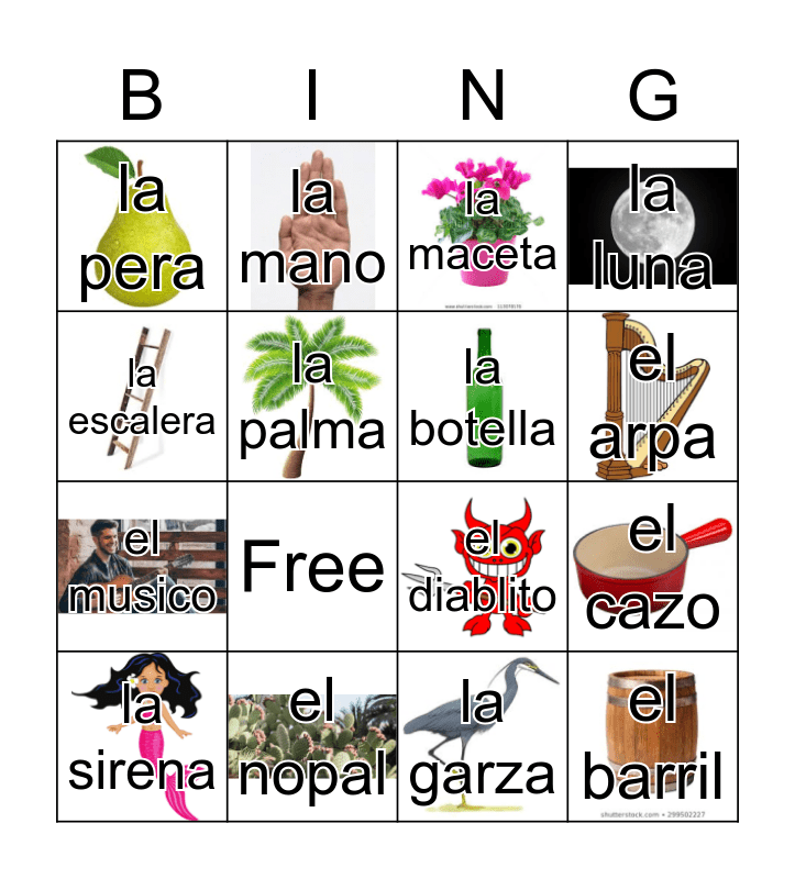 This bingo card has 30 images and 32 words: la campana, el venado, el cazo, la bandera, el barril, la botella, la escalera, el pajarito, la mano, la rana, el arpa, la maceta, la bota, el valiente, el nopal, el melon, la corona, el diablito, el tambor, el pescado, el gorrito, el corazon, la garza, la dama, la sirena, la luna, el musico, la palma, la pera, el pino, Bingo and Free.