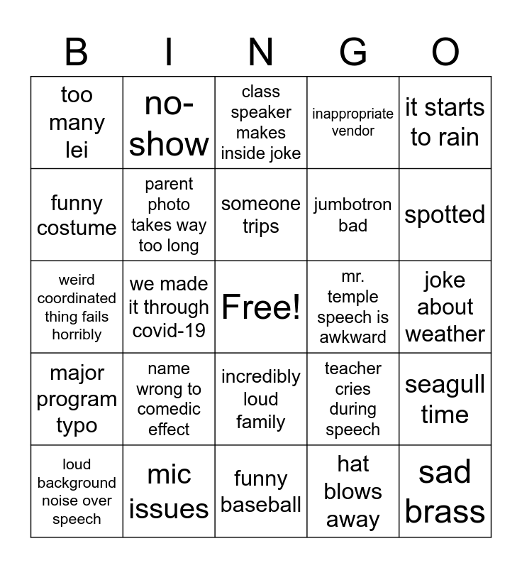 This bingo card has a free space and 24 words: name wrong to comedic effect, mic issues, someone trips, loud background noise over speech, it starts to rain, too many lei, funny costume, no-show, mr. temple speech is awkward, incredibly loud family, jumbotron bad, weird coordinated thing fails horribly, teacher cries during speech, seagull time, parent photo takes way too long, hat blows away, joke about weather, class speaker makes inside joke, spotted, we made it through covid-19, sad brass, major program typo, inappropriate vendor and funny baseball.