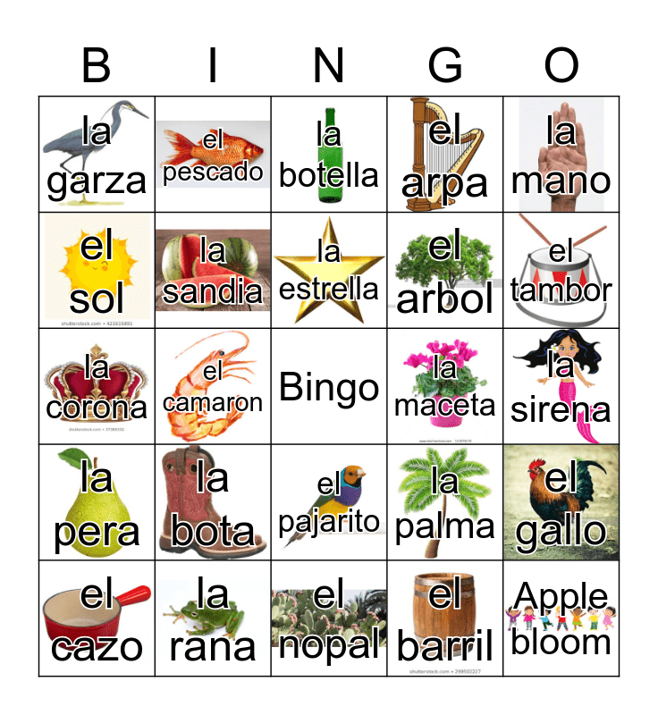 This bingo card has 44 images, a free space and 44 words: la campana, Apple bloom, el venado, el cazo, la bandera, el barril, la botella, la escalera, la mano, la rana, el arpa, la maceta, el pajarito, la bota, el valiente, el nopal, el melon, la corona, el diablito, el tambor, el pescado, el gorrito, el corazon, la garza, la dama, la sirena, la luna, el musico, la palma, la pera, el pino, el gallo, la rosa, el alacran, el camaron, la calavera, el soldado, la aranya, la estrella, el sol, el arbol, el paraguas, la sandia and el mundo.