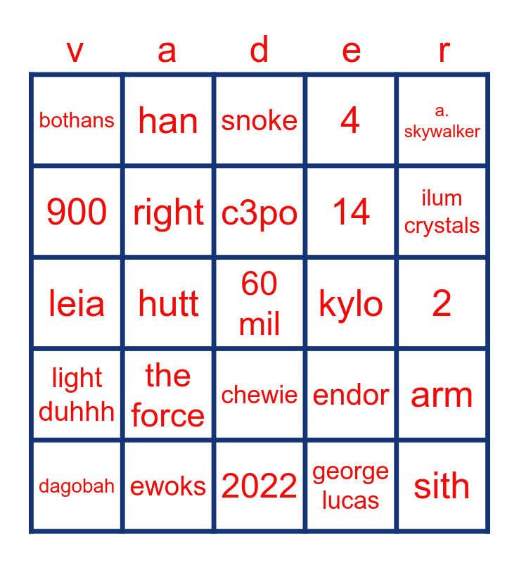 This bingo card has a free space and 24 words: the force, ewoks, c3po, dagobah, a. skywalker, bothans, 900, han, kylo, chewie, 14, leia, endor, arm, right, george lucas, 2, snoke, ilum crystals, hutt, sith, light duhhh, 4 and 2022.