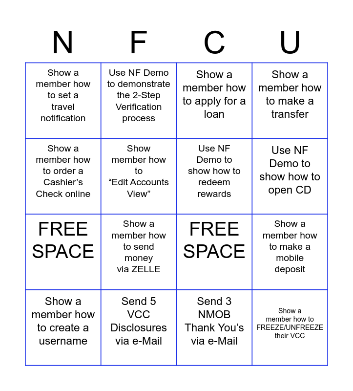 This bingo card has 16 words: Show a member how to create a username, Send 5 VCC Disclosures via e-Mail, Show a member how to apply for a loan, Show a member how to make a transfer, Show a member how to order a Cashier’s Check online, Use NF Demo to demonstrate the 2-Step Verification process, FREE SPACE, Show a member how to make a mobile deposit, Show a member how to set a travel notification, Show member how to “Edit Accounts View”, Send 3 NMOB Thank You’s via e-Mail, Use NF Demo to show how to open CD, FREE SPACE, Show a member how to send money via ZELLE, Use NF Demo to show how to redeem rewards and Show a member how to FREEZE/UNFREEZE their VCC.