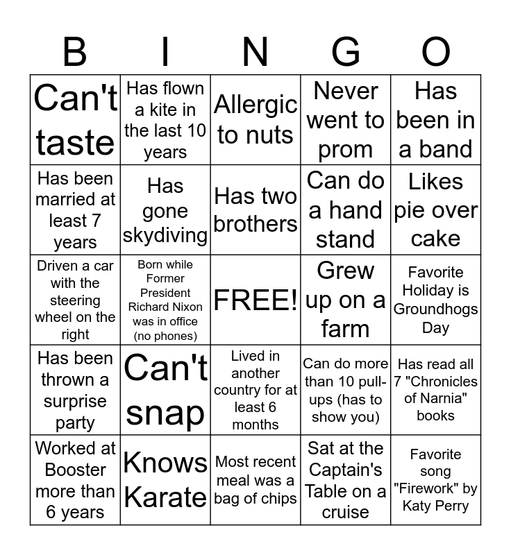 This bingo card has a free space and 24 words: Can't snap, Knows Karate, Has two brothers, Worked at Booster more than 6 years, Has been in a band, Can't taste, Has been married at least 7 years, Has flown a kite in the last 10 years, Grew up on a farm, Lived in another country for at least 6 months, Can do a hand stand, Driven a car with the steering wheel on the right, Can do more than 10 pull-ups (has to show you), Has read all 7 "Chronicles of Narnia" books, Has gone skydiving, Sat at the Captain's Table on a cruise, Favorite Holiday is Groundhogs Day, Allergic to nuts, Likes pie over cake, Born while Former President Richard Nixon was in office (no phones), Favorite song "Firework" by Katy Perry, Has been thrown a surprise party, Never went to prom and Most recent meal was a bag of chips.