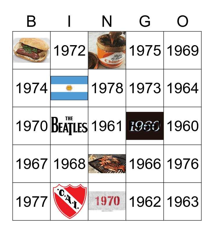 This bingo card has 10 images and 21 words: Free!, 1960, 1961, 1962, 1963, 1964, 1965, 1966, 1967, 1968, 1969, 1970, 1971, 1972, 1973, 1974, 1975, 1976, 1977, 1978 and 1979.