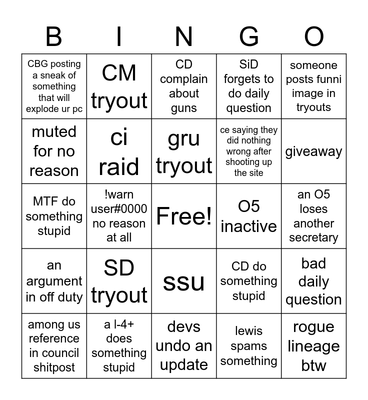 This bingo card has a free space and 24 words: SD tryout, a l-4+ does something stupid, gru tryout, among us reference in council shitpost, someone posts funni image in tryouts, CBG posting a sneak of something that will explode ur pc, muted for no reason, CM tryout, O5 inactive, ssu, ce saying they did nothing wrong after shooting up the site, MTF do something stupid, CD do something stupid, bad daily question, ci raid, lewis spams something, an O5 loses another secretary, CD complain about guns, giveaway, !warn user#0000 no reason at all, rogue lineage btw, an argument in off duty, SiD forgets to do daily question and devs undo an update.